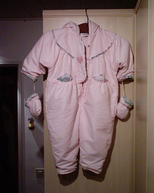 Dieser wunderschöne Schneeanzug ist - erstaunlicherweise -leicht waschbar! Die Fäustlinge sind mit einem kleinen Bändchen festgemacht, können also nicht verloren gehen. Der Reissverschluss an der Vorderseite ist teilweise noch durch eine Stoffblende mit Druckknöpfen verdeckt.
